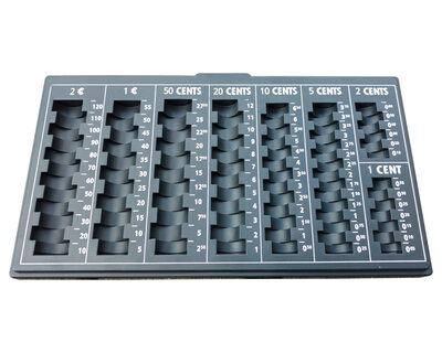 • herausnehmbares Zählbrett  für Münzen: 2 euro (60x),1 euro (55x), 50 cent (55x), 20 cent (60x), 10 cent (65x), 5 cent (75x), 2 cent (30x) und 1 cent (35x)