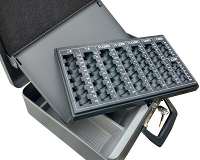 Die großzügige Geldkassette ist der ideale Ort, um Münzen und Scheine übersichtlich aufzubewahren. Durch das integrierte Zählbrett haben Sie schnellen Zugriff auf die verschiedenen Münzen - ganz ohne Suchen. Das Zählbrett stellt sich automatisch beim Öffnen auf und erleichtert Ihnen die Arbeit beim Zählen. Der Schaumstoffeinsatz im Deckel fixiert die Münzen beim Transport. Der Geldscheineinsatz besitzt 4 Scheinfächer und ist auch herausnehmbar.