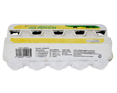 • auf der Vorderseite befindet sich nochmals der Aufdruck "10 frische Eier" sowie der Hinweis "Güteklasse A"