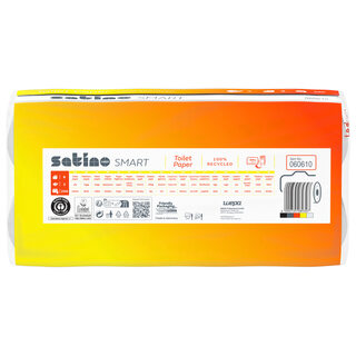 Das 2-lagige Satino Smart kleinrollen Toilettenpapier wird aus 100% Recycling Material hergestellt.